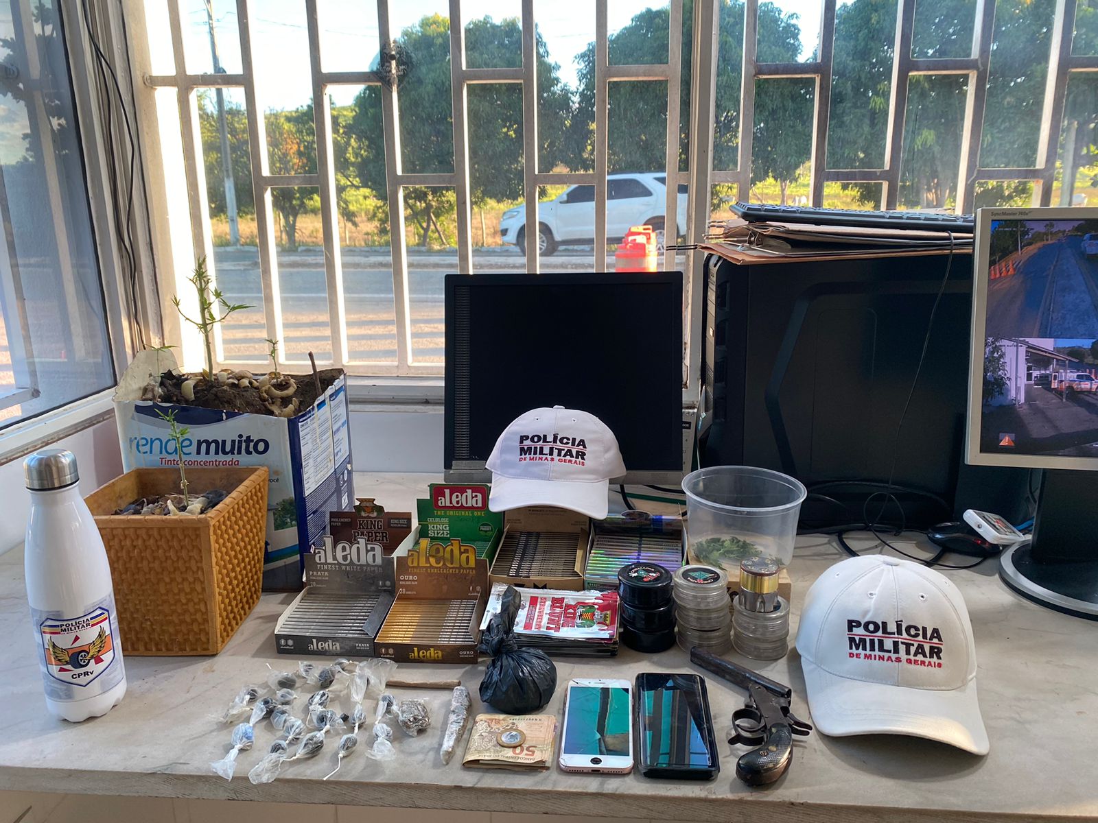Além de outras apreensões durante a ação da Polícia Militar: garrucha Rossi calibre 22, 50 gramas de cocaína, papelote de cocaína, porção média de maconha, porção pequena de maconha, cigarro de maconha, 20 bolas de haxixe, quatro ecstasys, quatro pés de maconha de pequeno porte pequenos; uma porção de folhas de maconha in natura, 12 dichavadores e sete caixas com invólucros de papel de seda.
