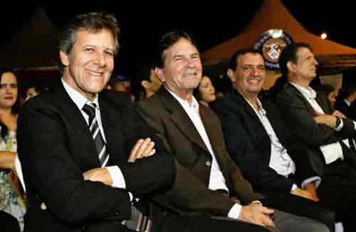 Na abertura oficial da Expoleste 2019, o presidente do Sicoob Crediriodoce, Cantídio Ferreira; o vice-presidente da Cooperativa, Fernando Ferreira; e o presidente da Cooperativa, João Marques.