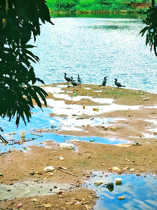 Biguás procuram peixes em área cheia de detritos plásticos | FOTO: Fred Seixas