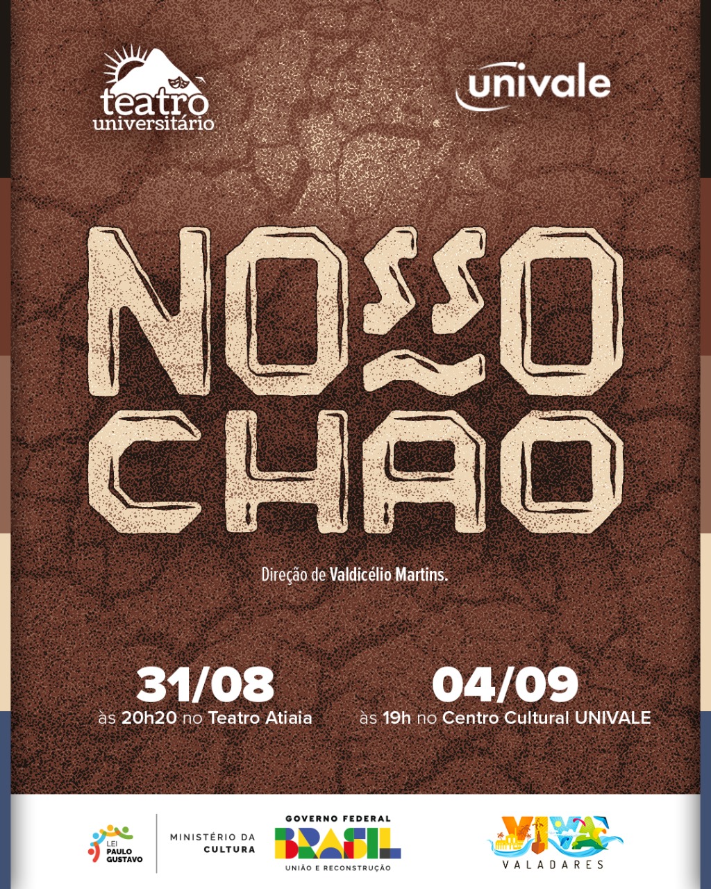 GOVERNADOR VALADARES – O espetáculo “Nosso chão”, produzido pelo projeto de extensão Teatro Universitário UNIVALE, com apoio da Lei Federal de Incentivo à Cultura Paulo Gustavo (LPG, 2024), terá estreia dia 31 de agosto no Teatro Atiaia (às 20h20) e dia 4 de setembro no Centro Cultural Hermírio Gomes da Silva, no campus II da universidade (19h19).