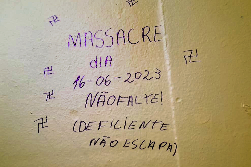 Além disso, o responsável pela ameaça também desenhou na parede várias suásticas em apologia ao nazismo.