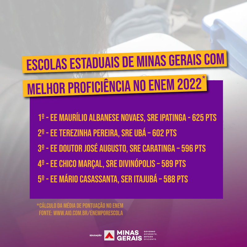 Conforme o pesquisador Mateus Prado Henfil, um dos responsáveis pelo levantamento, Minas Gerais aparece em três pontos importantes. “Em 2020, 2021 e 2022, Minas foi o estado com a maior nota média por escola do Enem. É agora o estado que tem uma escola pública que não seleciona. Ou seja, aquela que não realiza prova para admissão, com a maior nota. Além disso, entre as escolas privadas, Minas tem também uma escola particular com a melhor pontuação. O resultado é muito bom, animador. Mas é importante que a gente trabalhe para que esses indicadores aumentem e que usemos os dados para chegar a resultados cada vez melhores”, ressalta Henfil.