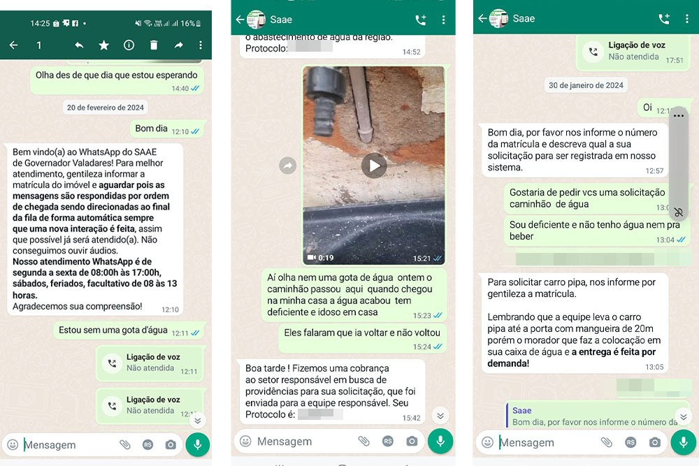 Para provar a situação, a mulher guarda prints de solicitações feitas ao Serviço Autônomo de Água e Esgoto (SAAE). Desde o dia 29 de janeiro, após o registro de vários protocolos, o problema continua.