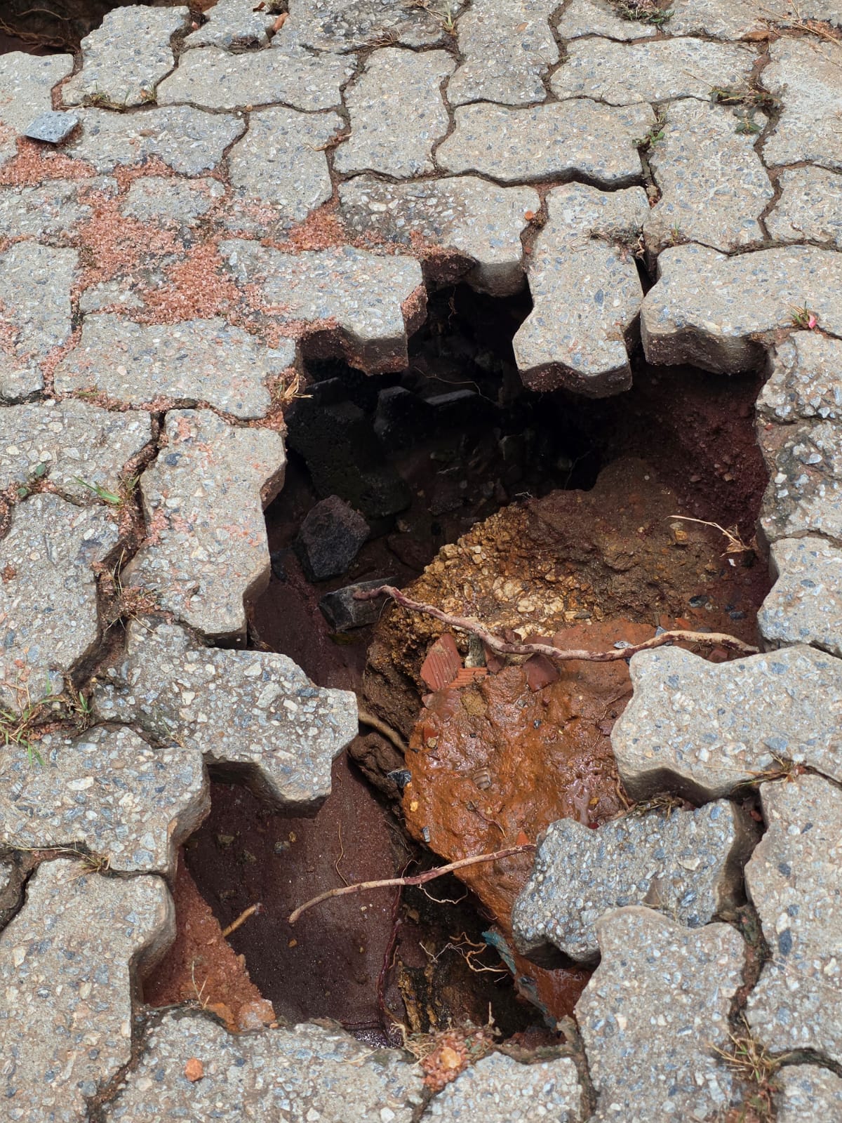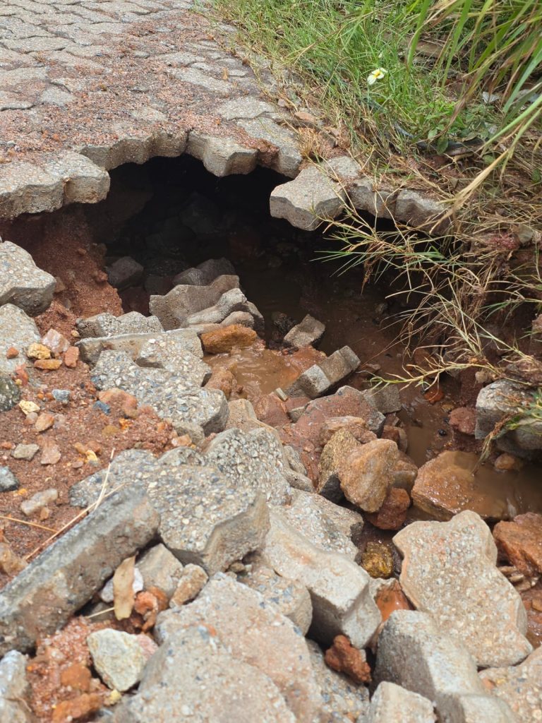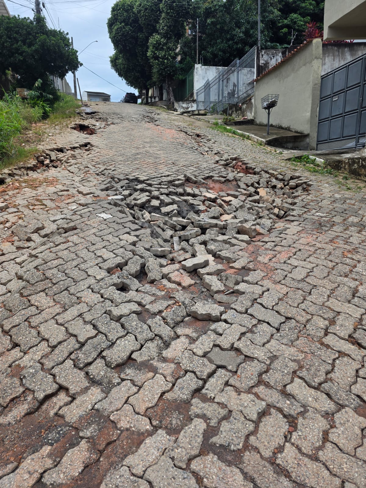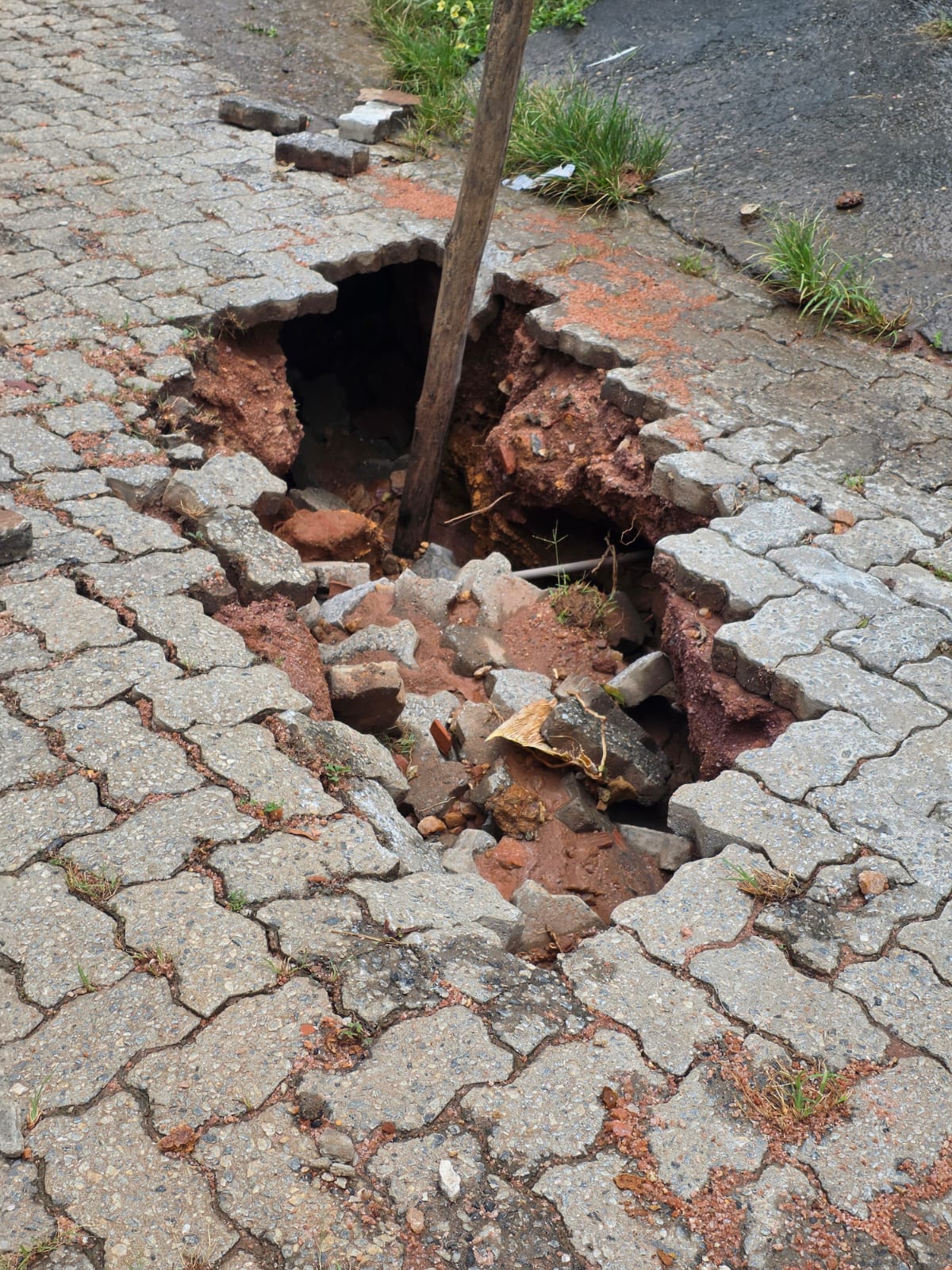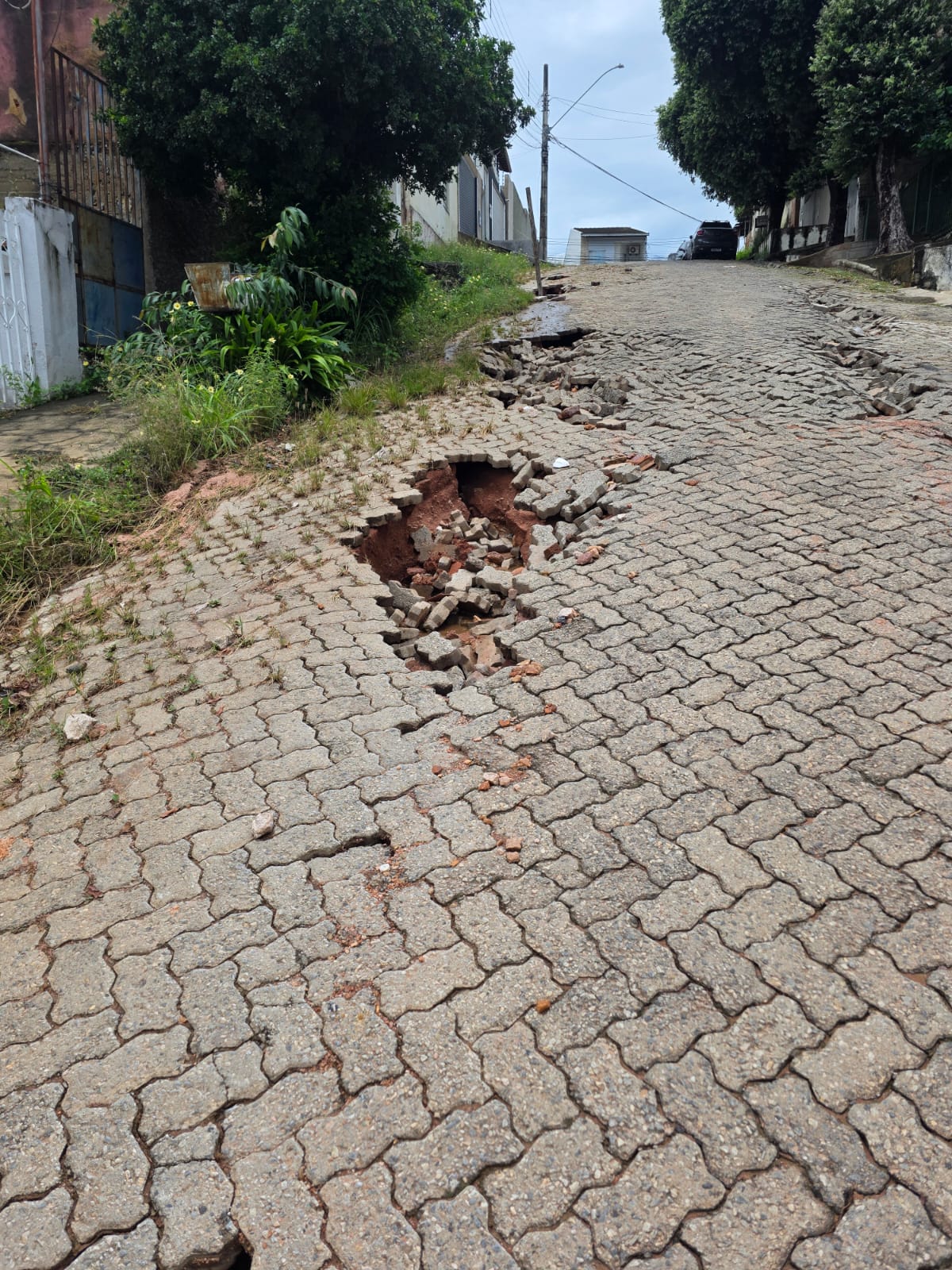 Imagens feitas por quem vive na região mostram partes do calçamento deslocadas e grandes aberturas no chão, causadas pelo volume de água que desceu pela rua durante os temporais. A cada nova chuva, a situação se agrava, ampliando os danos e aumentando o risco de acidentes, principalmente para pedestres, motociclistas e veículos de pequeno porte.