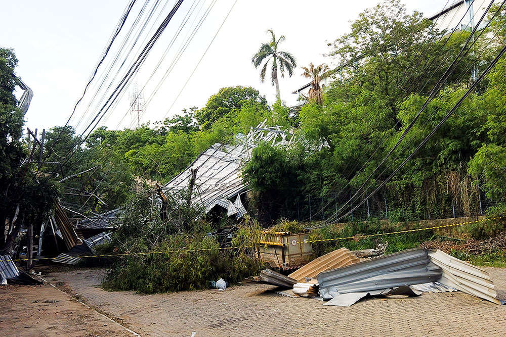 No centro da cidade, uma casa de eventos também teve a estrutura atingida. O telhado soltou e o muro cedeu durante o temporal.