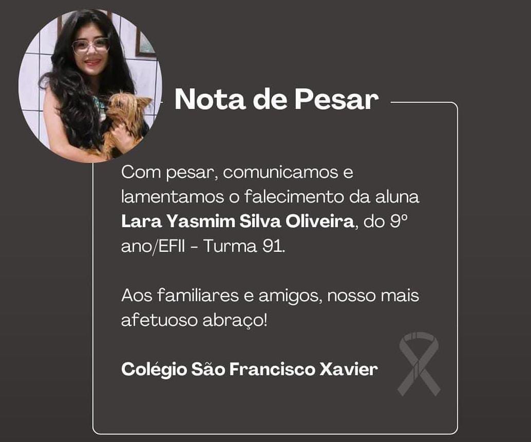 IPATINGA – Morreu no Hospital Márcio Cunha (HMC), em Ipatinga, mais uma vítima do grave acidente registrado na BR-458, próximo a Caratinga, na última sexta-feira (14). A informação foi divulgada pelo Colégio São Francisco Xavier (CSFX), onde Lara Yasmin Silva Oliveira, de 14 anos, estudava.