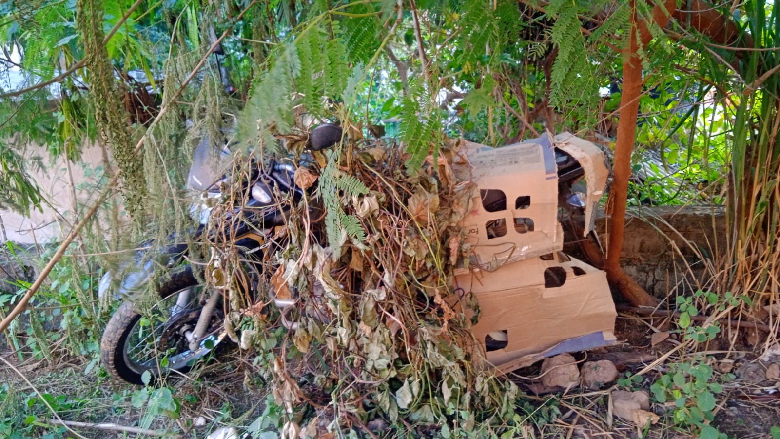 Então a PM foi até o endereço e encontrou a moto, uma Honda Bross, embaixo de entulhos, em um beco. Segundo os militares, após encontrar a motocicleta, a equipe constatou a existência de uma queixa de furto do veículo.