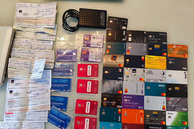 Durante a operação, os investigadores apreenderam quatro notebooks, seis celulares, dois HDs, um pendrive, cinco cadernos com anotações, R$ 22.715 em dinheiro, um token de segurança, diversos documentos, 30 modems, 14 cheques, 126 cartões, 24 máquinas de cartão, uma chipeira e 11 chips de operadoras.