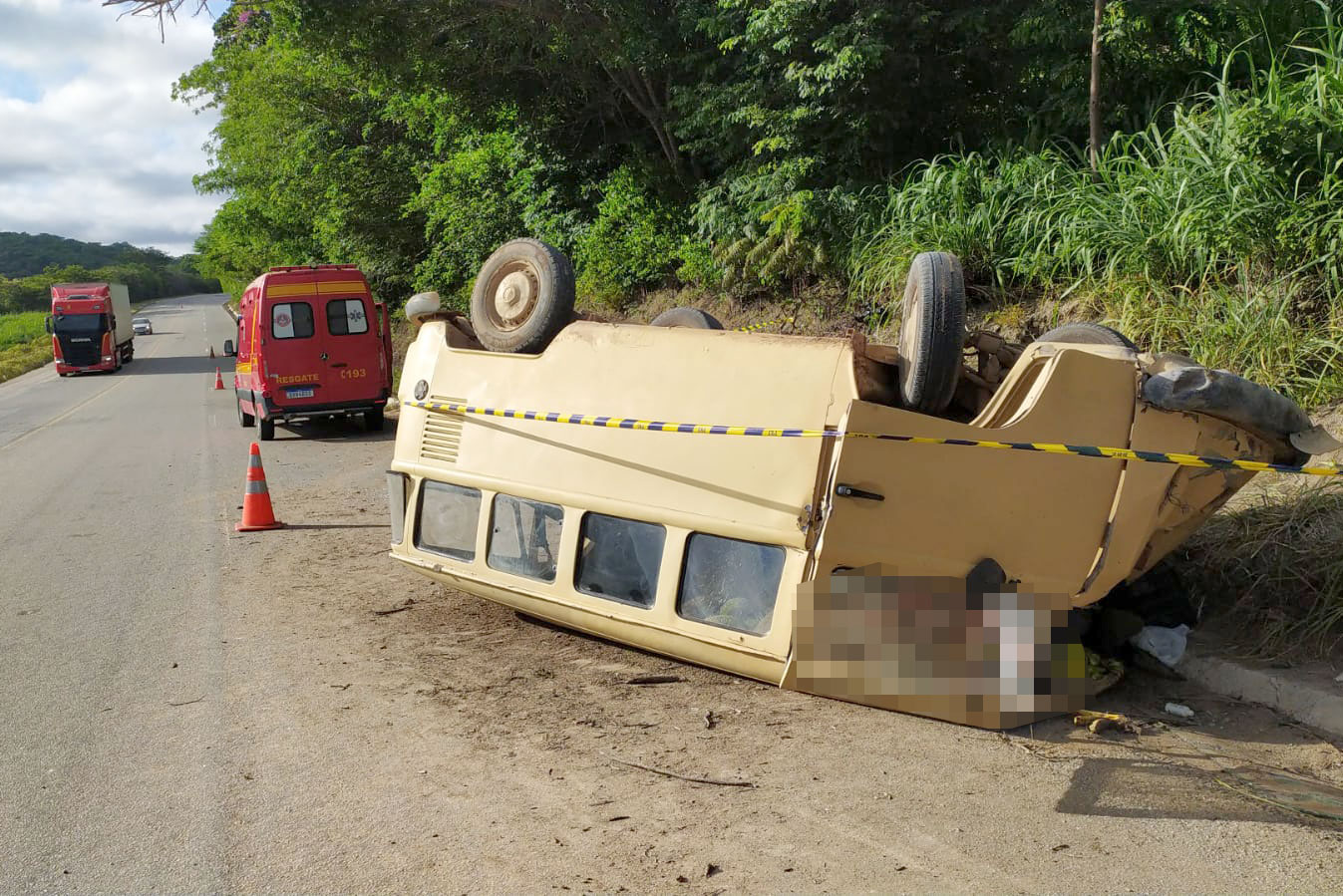 A Kombi capotou após a colisão com o animal