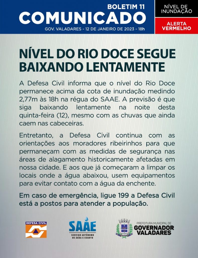 Mais cedo, a Prefeitura de Valadares, por meio da Defesa Civil, informou que a previsão é que o rio continue baixando lentamente na noite de quinta para sexta-feira (13), apesar das chuvas.
