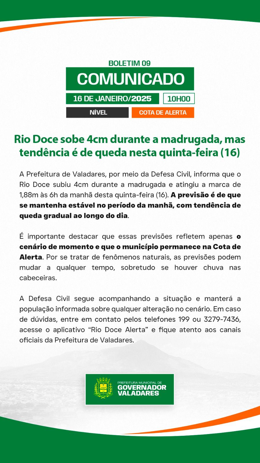 A população pode entrar em contato com a Defesa Civil pelos telefones 199 ou 3279-7436 para mais informações e dúvidas. Além disso, é possível monitorar o nível do rio pelo aplicativo “Rio Doce Alerta” e ficar atento aos canais oficiais da Prefeitura de Valadares.