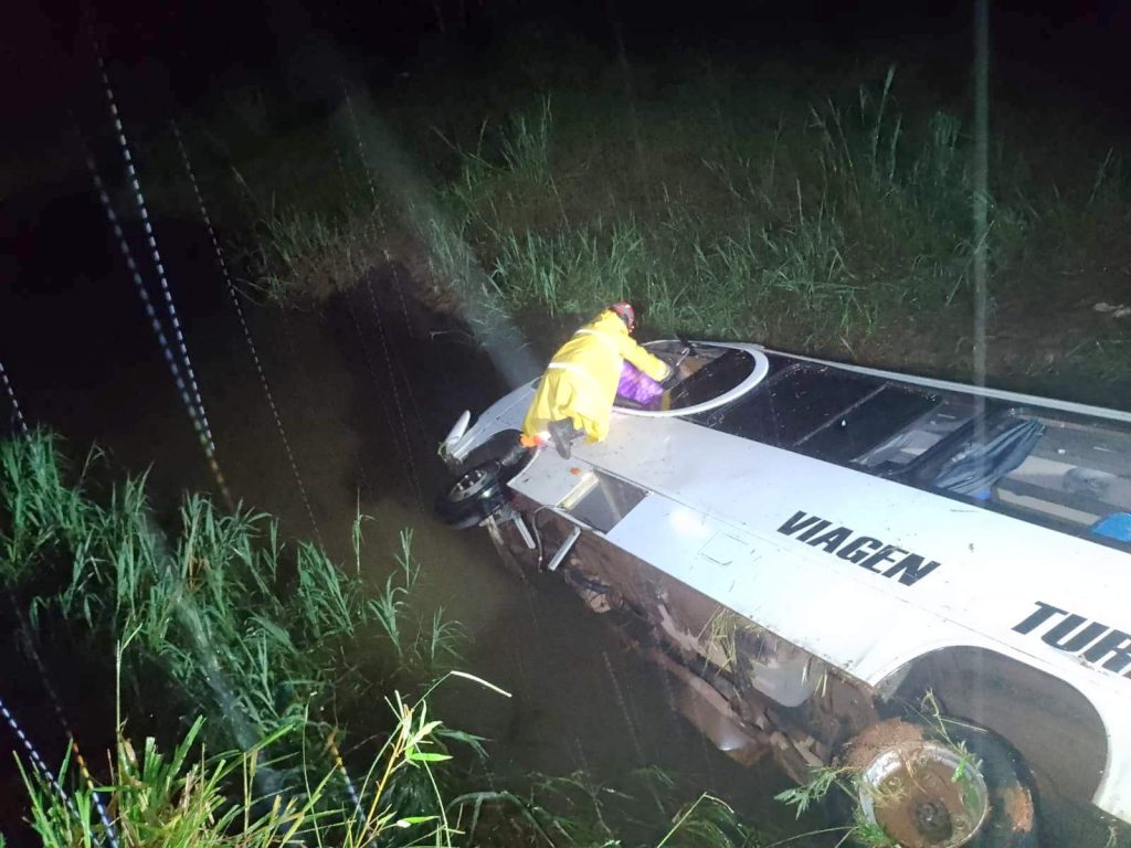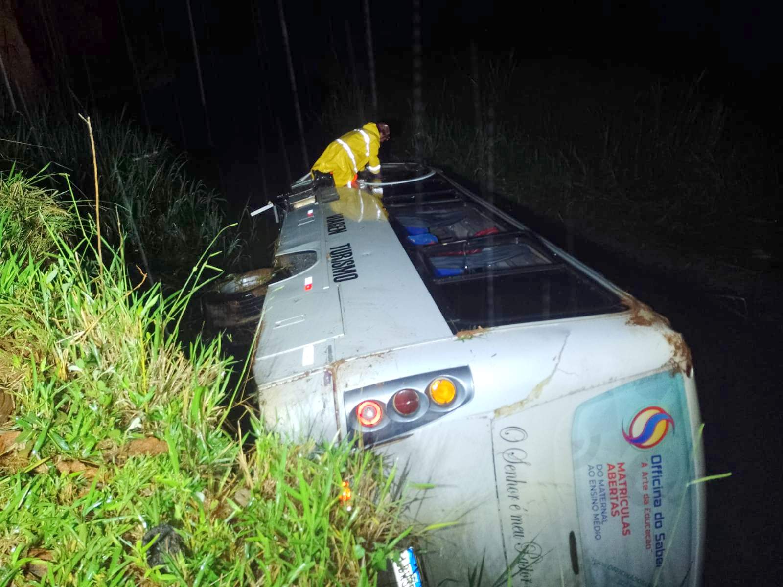 O acidente aconteceu na noite desta sexta-feira (22), no KM 595, entre Realeza e São João do Manhuaçu. Segundo a Polícia Rodoviária Federal (PRF), o motorista perdeu o controle do veículo. Parte do ônibus ficou sob as águas do rio Manhuaçu.
