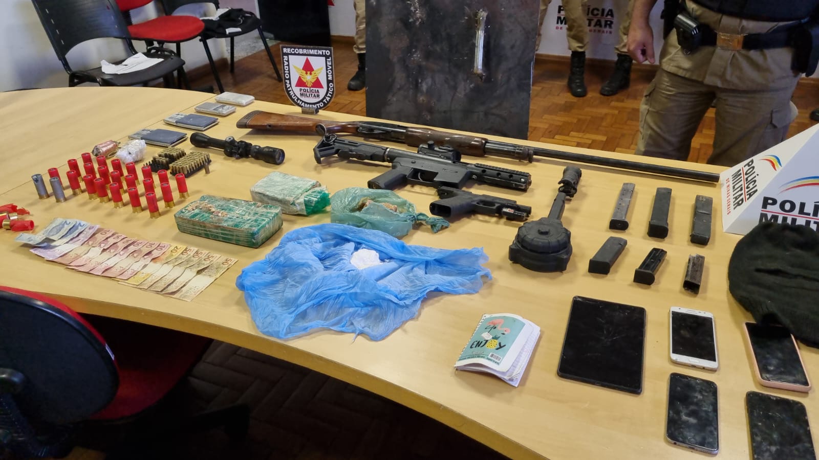 - Três armas de fogo, sendo uma pistola Glock 9 mm com kit rajada e mira laser, uma espingarda calibre 12 e uma submetralhadora calibre 9 mm;