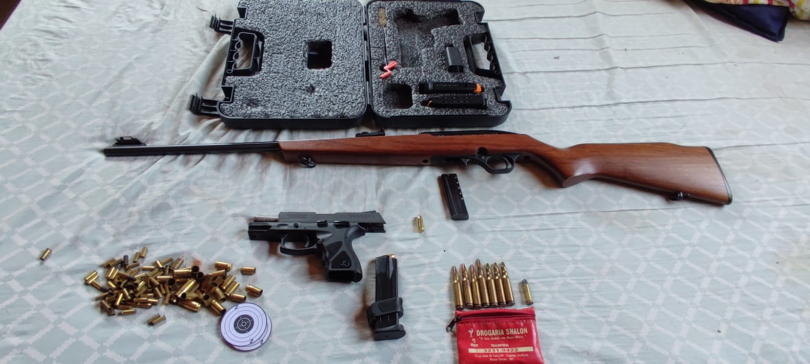 No segundo endereço alvo, em cumprimento a mandado de busca vinculado à perda da idoneidade para porte de armas, foram apreendidas uma carabina calibre .22, um rifle calibre .44, um revólver calibre .38, munições e acessórios de armamento. Documentos e celulares também foram recolhidos para análise.