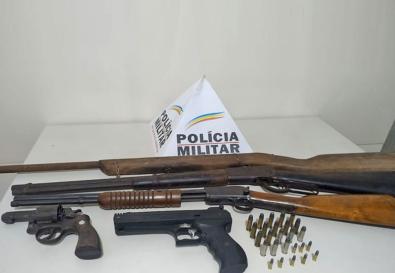 Em seguida, após buscas no interior dos imóveis, foram encontrados: 1 revólver, 1 carabina e 18 munições calibres 38; 1 carabina e 8 munições calibre 22; 1 espingarda polveira e 1 simulacro de pistola.