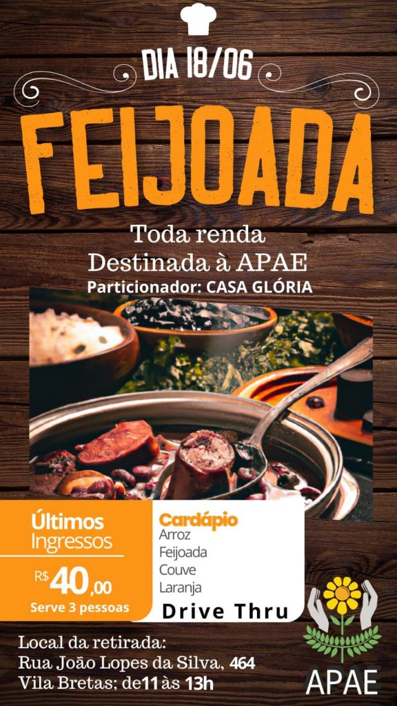 Reserve o seu ingresso para a venda de feijoada em prol da Apae e faça parte dessa corrente de solidariedade. Para adquirir seu ingresso antecipado, clique aqui.