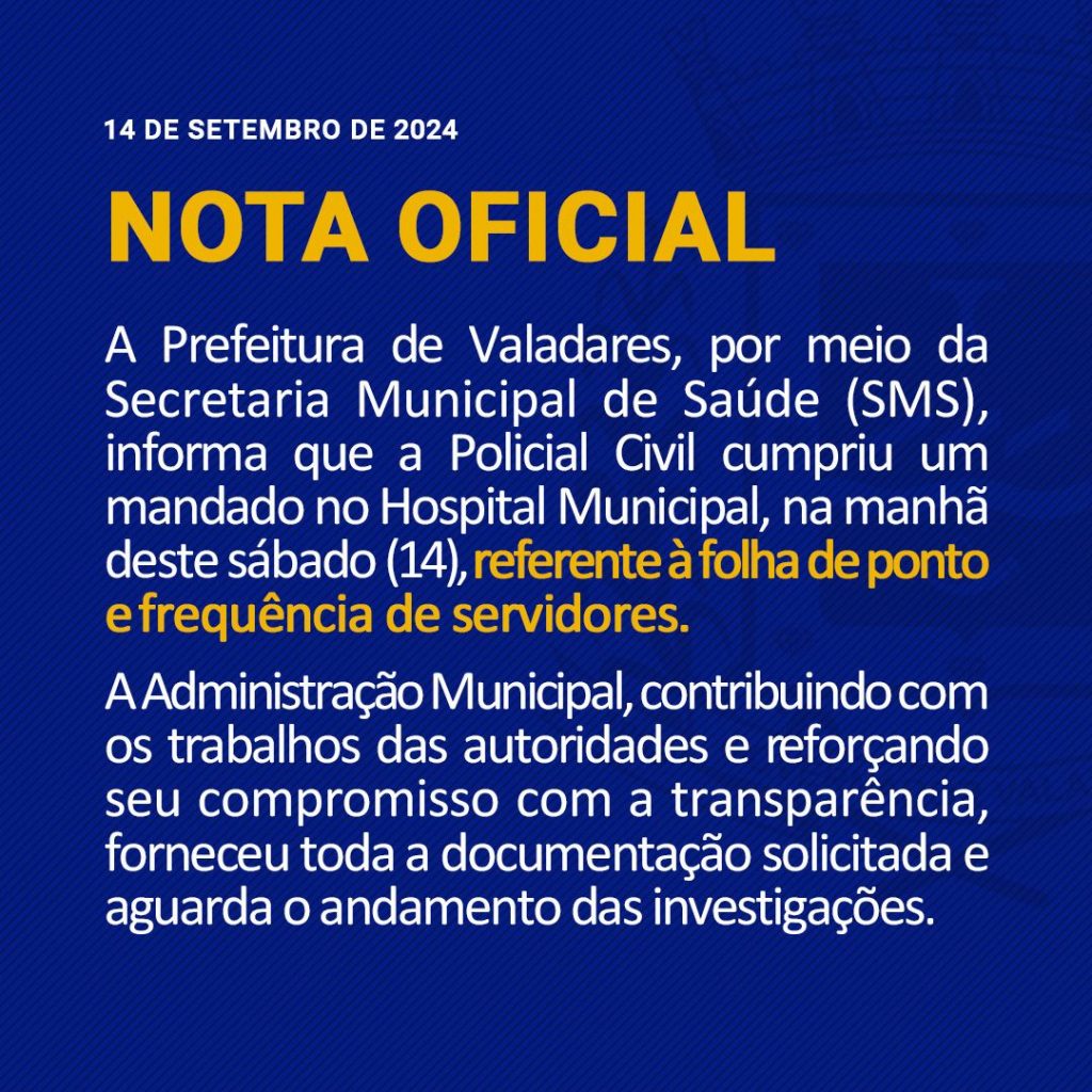 Ainda no sábado (14), a Prefeitura de Valadares, por meio de nota oficial, afirmou que está colaborando com as investigações e forneceu toda a documentação que a polícia solicitou. A Administração Municipal reforçou seu compromisso com a transparência e aguarda o andamento das investigações.