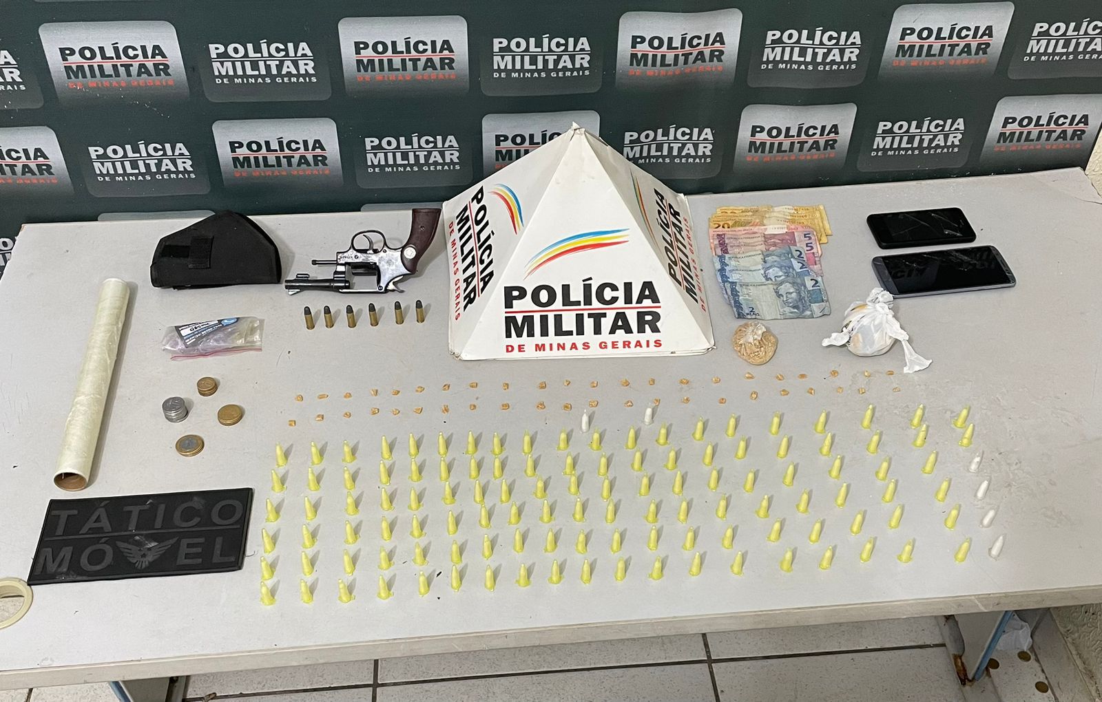 A Polícia Militar (PM) apreendeu drogas, revólver e dinheiro no bairro Vila Rica, em Valadares, nessa quinta-feira (23). Os militares receberam informações sobre um intenso tráfico de drogas e, ao abordarem a residência, o suspeito tentou fugir, mas acabou preso.