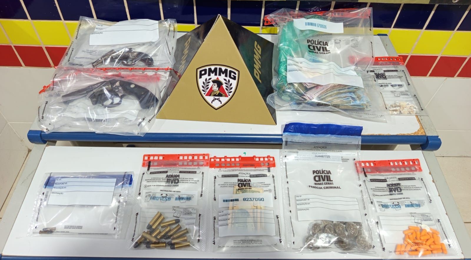 Ao todo, foram apreendidas 30 cápsulas de cocaína, um papelote de cocaína, 17 pedras de crack, 13 buchas de maconha, duas armas de fogo (uma garrucha calibre .22 e um revólver calibre .38), 14 munições calibre .38, duas munições calibre .22, além de R$ 1.334 em dinheiro e US$ 13 (treze dólares).