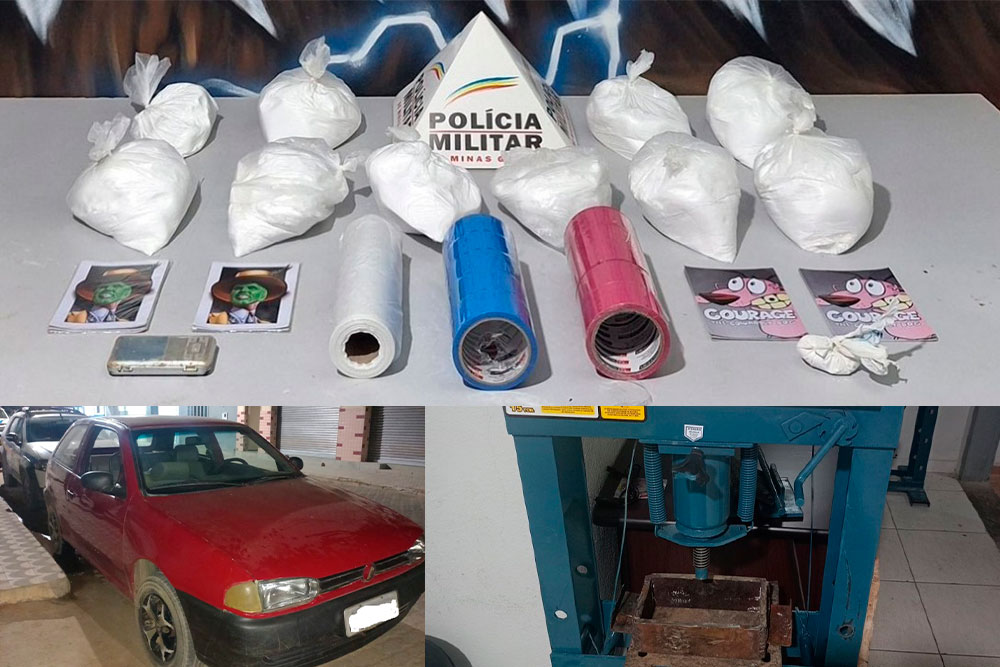 Ao entrarem no imóvel, acompanhados por uma testemunha, descobriram um esquema de processamento de drogas: dez sacolas com cocaína, balança de precisão, prensa hidráulica, rolos de fita adesiva, embalagens plásticas e adesivos do personagem “Máskara”, símbolo da facção criminosa. Um cartão bancário em nome do motorista também foi apreendido.