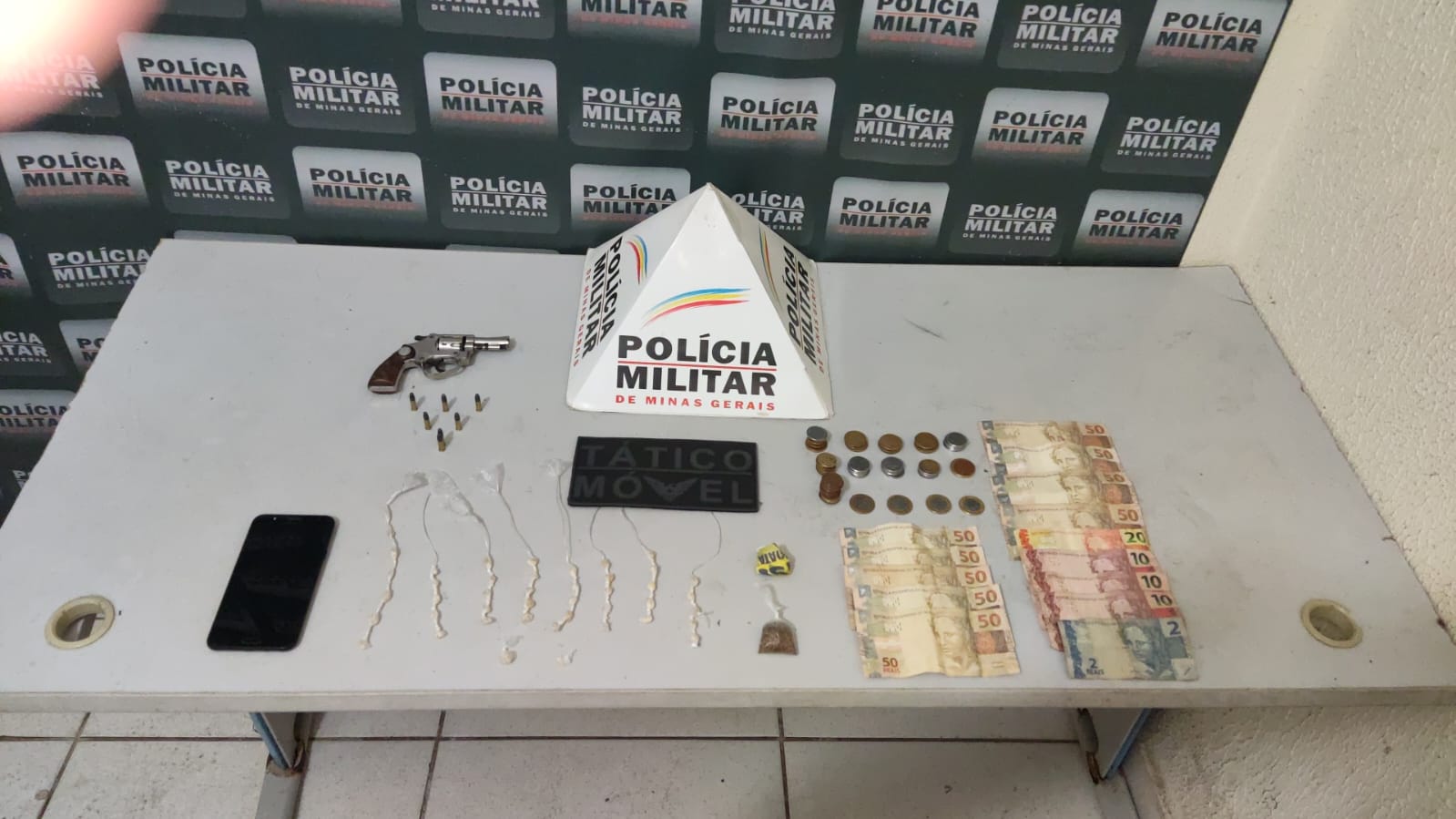 Nas buscas realizadas na residência os militares apreenderam os seguintes materiais: uma porção e 44 pedras de substância semelhante à crack, uma porção de substância semelhante à maconha, um revólver calibre 22, 7 munições intactas de calibre 22, um aparelho celular e R$ 521,05 em dinheiro