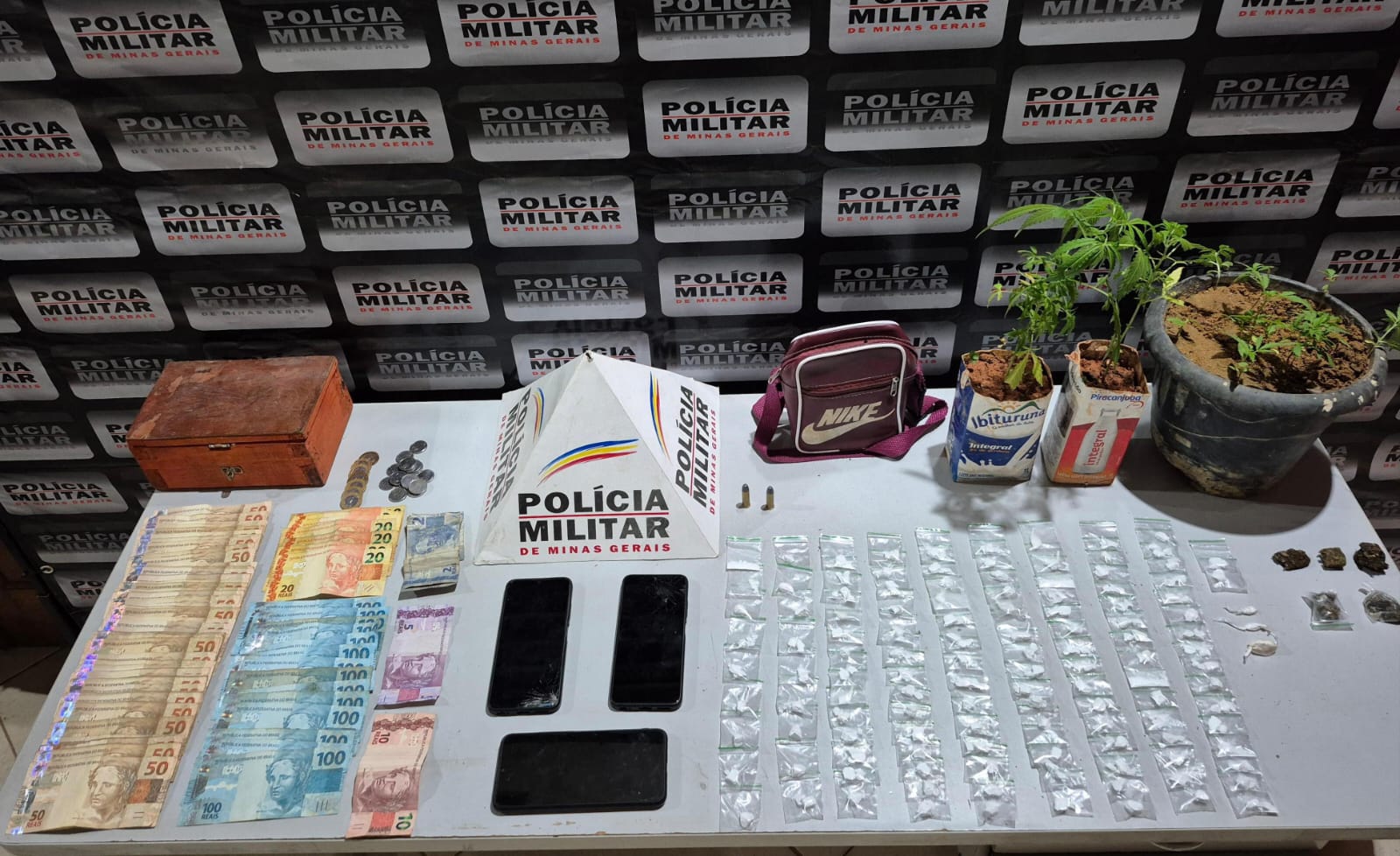 Em seguida, os militares realizaram incursão na residência monitorada, onde os autores foram capturados. No local, foram apreendidos 124 papelotes de cocaína, cinco buchas de maconha, três vasos com plantas de Cannabis sativa, dois cartuchos calibre .38, R$ 6.075,00 em dinheiro e três celulares.