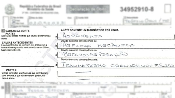 Segundo a perícia da Polícia Civil do Espírito Santo, as causas da morte foram asfixia mecânica, traumatismo cranioencefálico, broncoaspiração e baixa concentração de oxigênio no sangue.