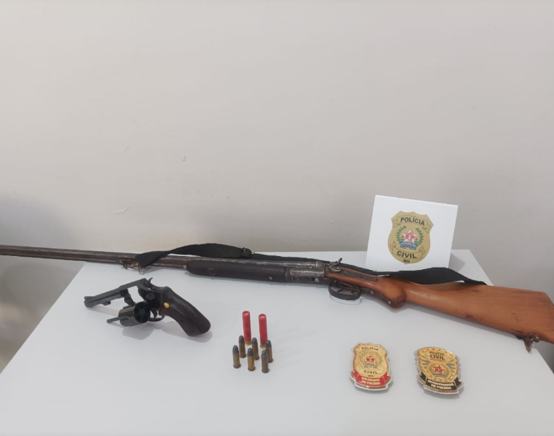 A equipe se deparou com residência do suspeito de portas abertas enquanto ele tentava fugir e, com autorização do próprio, entrou no imóvel. No quintal da residência, a polícia encontrou um revólver calibre 38 com numeração raspada, além de uma espingarda com munições.