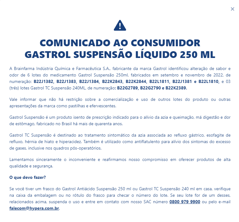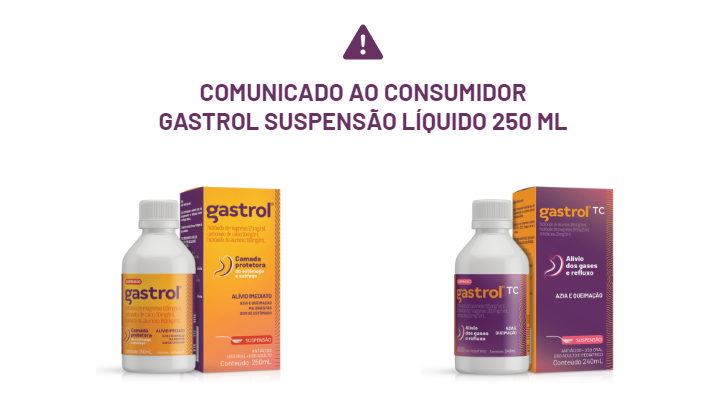 A proibição de venda, porém, se refere aos lotes B22J1380, B22J1381, B22J1382, B22J1383, B22J1384, B22K2843, B22K2844, B22L1811 do Gastrol TC Suspensão 250 ml e aos lotes B22G2789, B22G2790 e B22K2389 do Gastrol TC Suspensão 240 ml.
