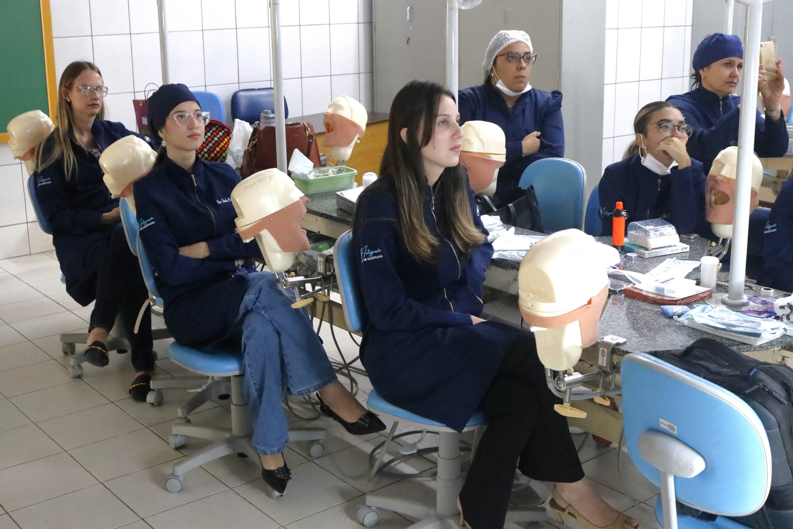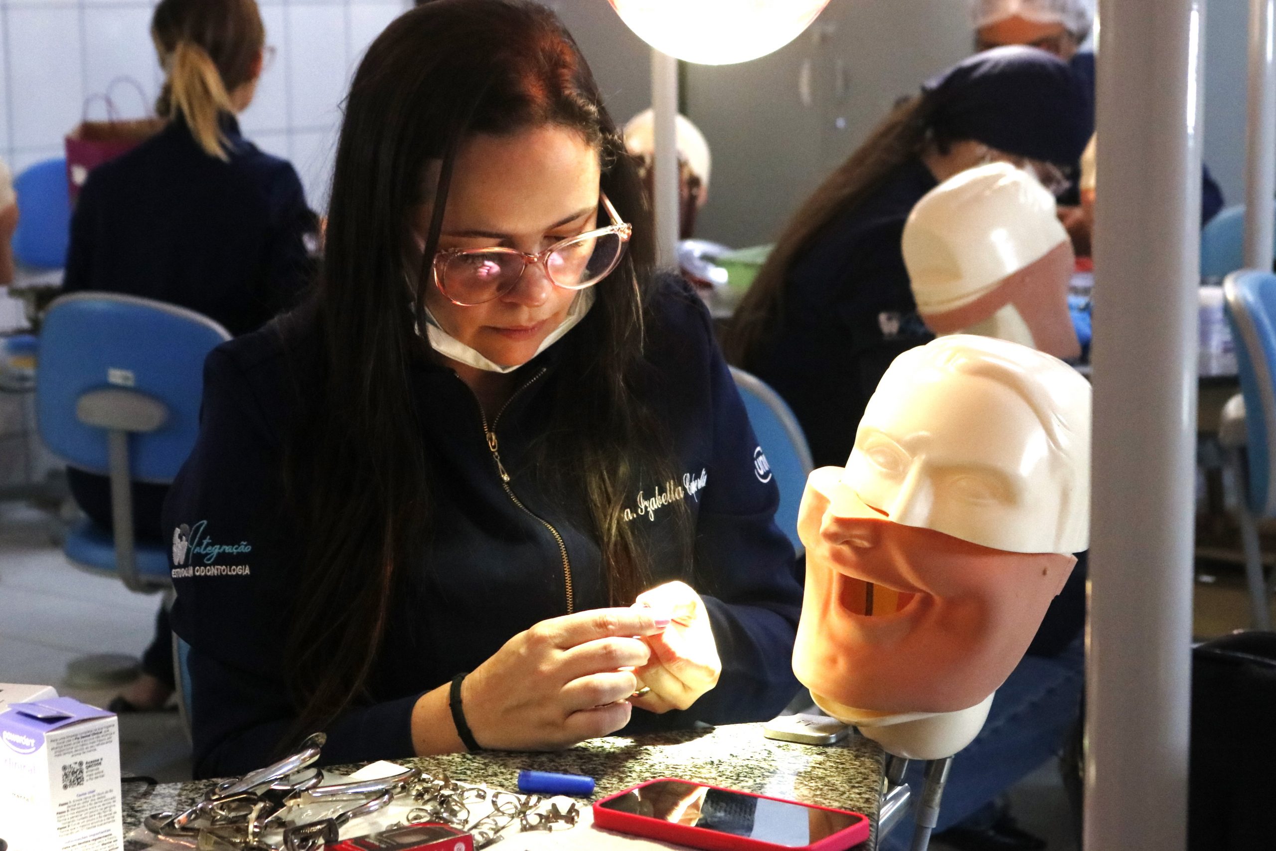 “O isolamento absoluto é uma técnica em que a gente usa o material em um ambiente oral, que é um ambiente úmido, e a gente tenta tirar essa umidade do material. Esse é o principal foco do isolamento absoluto, e a gente discutiu as técnicas e o que a gente tem de material sobre isolamento”, explicou Caio Nobre, especialista em Prótese Dentária que ministrou a capacitação, que incluiu um momento prático, chamado de “hands on”, em que os alunos da pós-graduação treinaram o isolamento em um manequim.