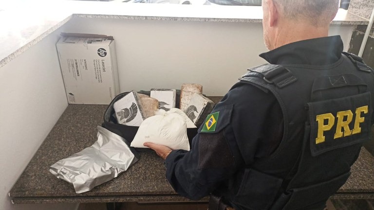 Ao abrirem a mala, os agentes da PRF encontraram um total de nove volumes de droga, sendo seis tabletes e três sacos contendo um pó branco. A substância foi submetida ao teste de identificação com tiocianato de cobalto, que confirmou tratar-se de cloridrato de cocaína.