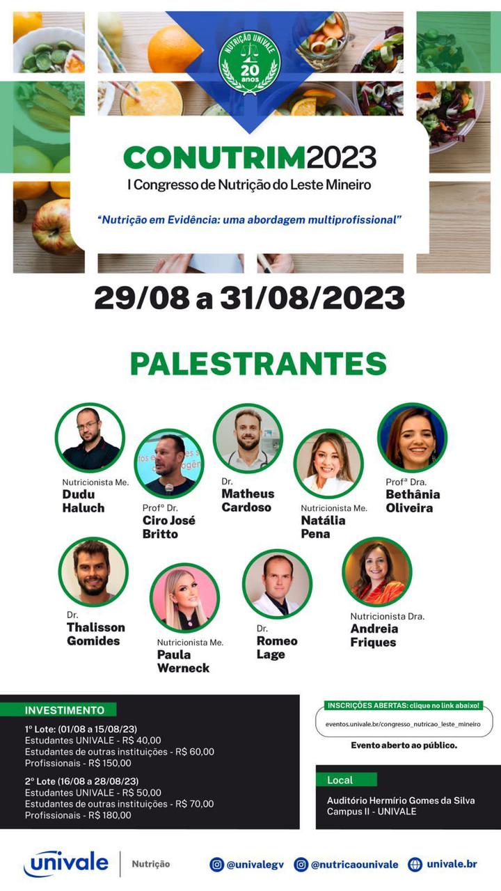 GOVERNADOR VALADARES – Estão abertas as inscrições para o Primeiro Congresso de Nutrição do Leste Mineiro (CONUTRIM). O evento acontecerá nos dias 29, 30 e 31 de agosto, na Universidade Vale do Rio Doce (Univale). Serão três dias de palestras, coffee break, muito conhecimento e interação.