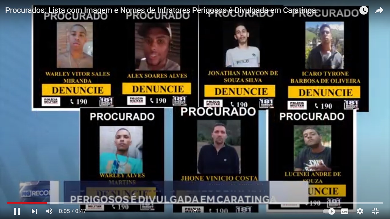 CARATINGA – A Polícia Militar em Caratinga divulgou uma lista de procurados do 62º Batalhão. São imagens e nomes de infratores em diversos crimes violentos com mandados de prisão decretados. Qualquer informação ou localização de um deles, disque-denúncia 181 ou 190 . Não precisa se identificar.