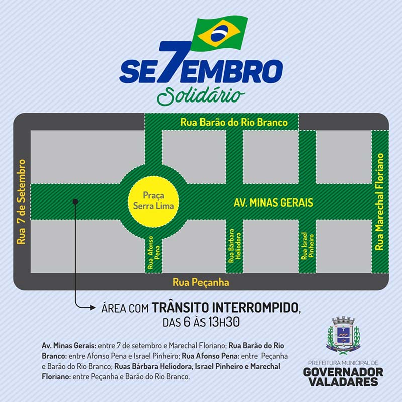 O desfile em comemoração ao Dia da Independência do Brasil irá movimentar o centro de Governador Valadares. Para os preparativos do desfile, algumas ruas serão interditadas nas primeiras horas da manhã desta sexta-feira (6). A partir das 6 horas será proibido o estacionamento no entorno da avenida Minas Gerais, entre a Marechal Floriano e a Israel Pinheiro. A via será fechada para a montagem do palanque e de arquibancadas. O desfile está marcado para começar amanhã às 8 horas, na praça Serra Lima, passando pela avenida Minas Gerais e se encerrando na rua Marechal Floriano.