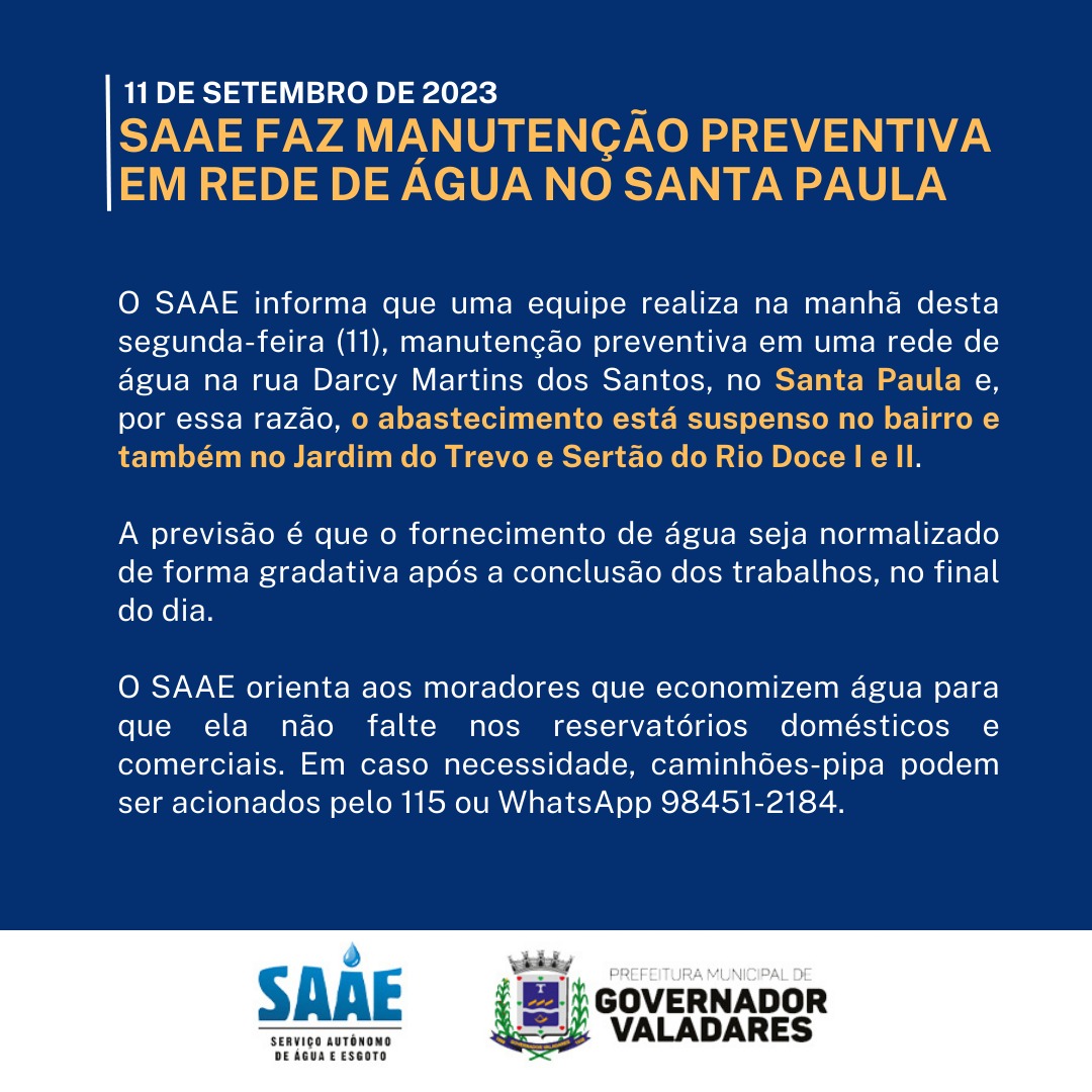 GOVERNADOR VALADARES – O Serviço Autônomo de Água e Esgoto (SAAE) informou, na manhã desta segunda-feira (11), que realiza manutenção preventiva em uma rede de água na rua Darcy Martins dos Santos, no bairro Santa Paula. Por conta dos trabalhos, o abastecimento de água está suspenso no Santa Paula, Jardim do Trevo e Sertão do Rio Doce I e II.