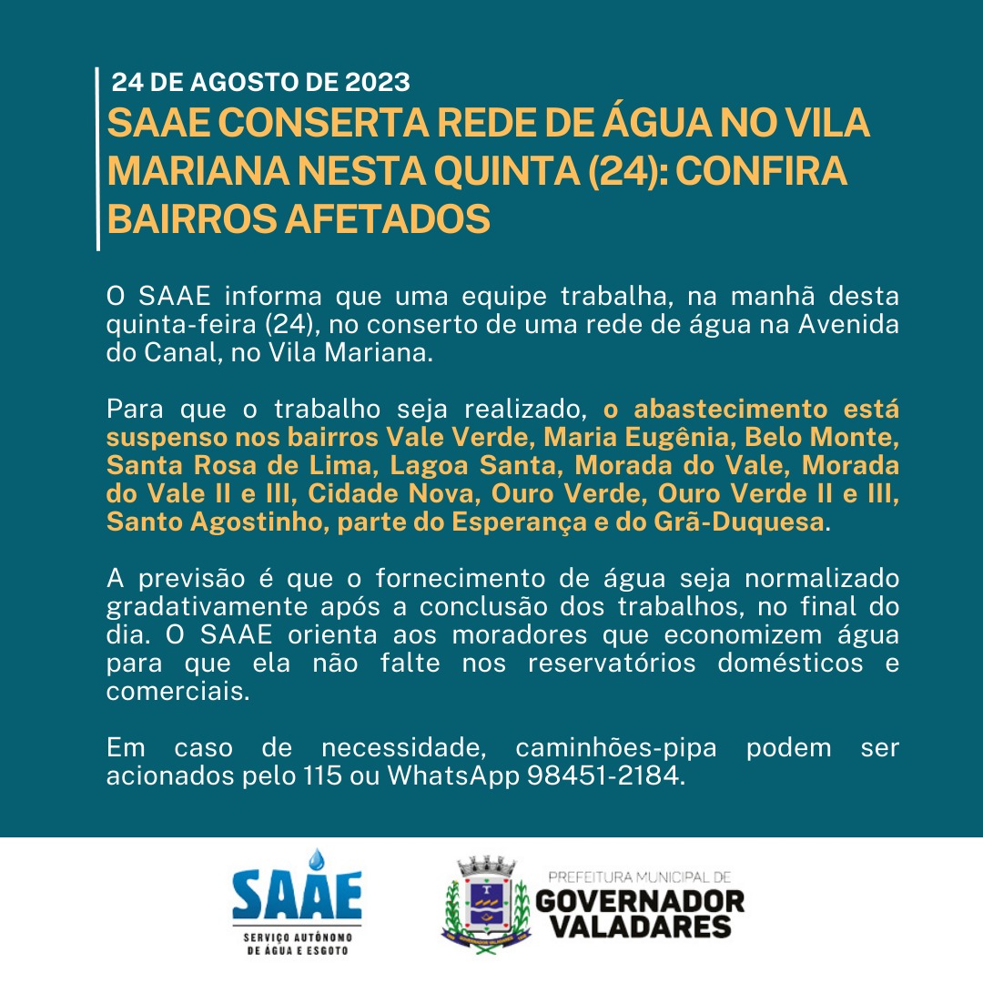 GOVERNADOR VALADARES – O Serviço Autônomo de Água e Esgoto (SAAE) realiza uma manutenção na rede de água na Avenida do Canal, no Vila Mariana. Por isso, o Vila Mariana e outros 15 bairros ficarão com o abastecimento suspenso nesta quinta-feira (24).