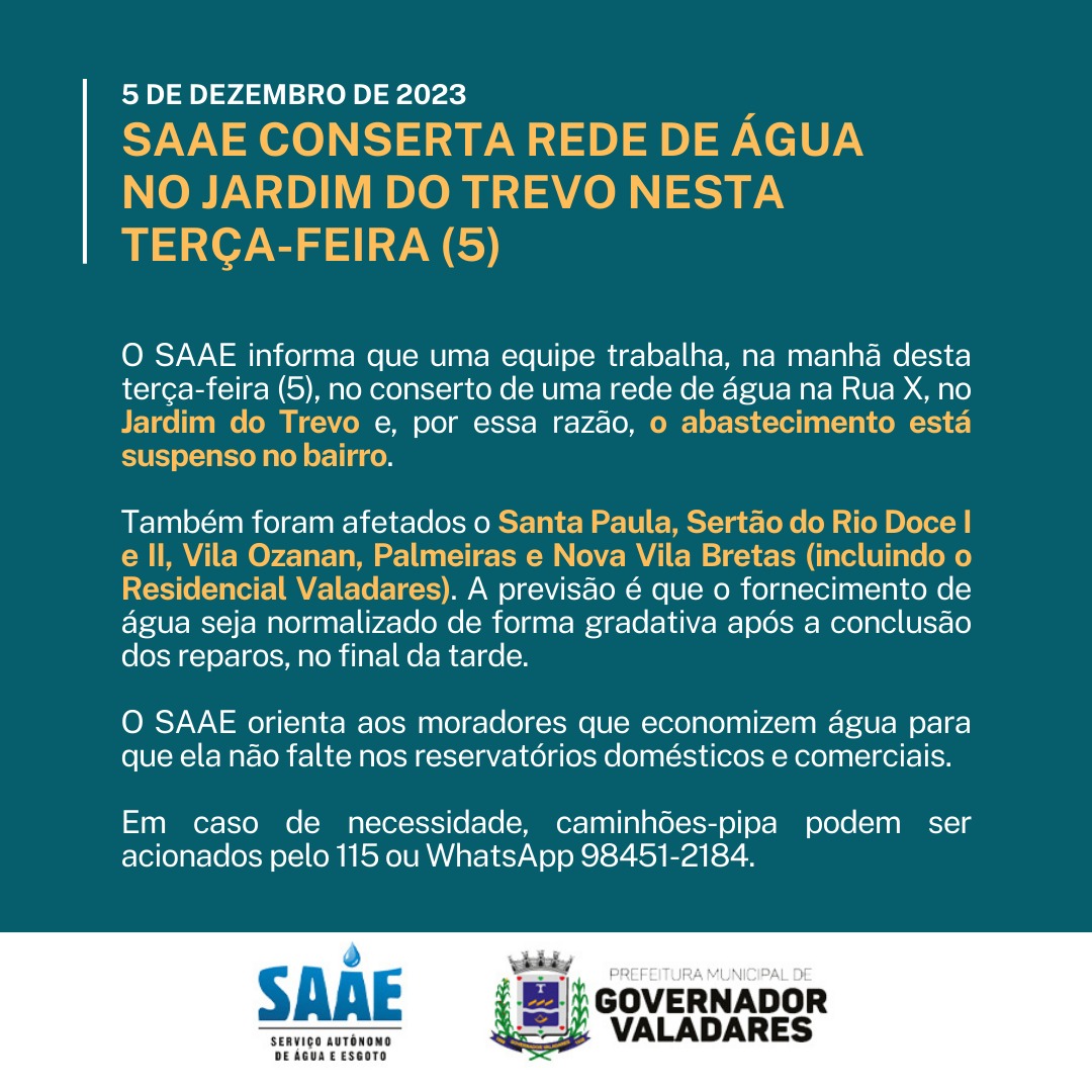 GOVERNADOR VALADARES – O Serviço Autônomo de Água e Esgoto (SAAE) de Valadares realiza, na manhã desta terça-feira (5), reparos em uma rede de água na Rua X, no Jardim do Trevo. Por conta dos trabalhos, o abastecimento de água está suspenso no bairro. O SAAE suspendeu o abastecimento também nos bairros Santa Paula, Sertão do Rio Doce I e II, Vila Ozanan, Palmeiras e Nova Vila Bretas. Incluindo, além desses, o Residencial Valadares.