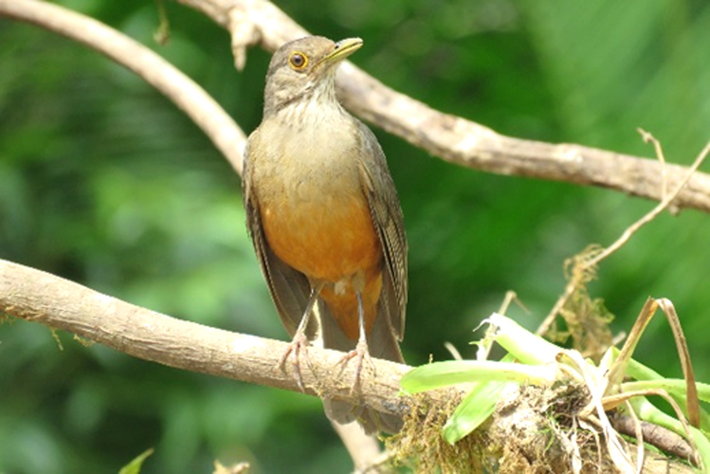 Já o Sabiá-Laranjeira, ao contrário, é pequeno, mede entre 20 e 25cm de comprimento, os machos pesam cerca de 70g, enquanto as fêmeas pesam um pouco mais, 80g. Ave-símbolo, é caracterizada por plumagem parda, ventre vermelho-ferrugem, anel amarelo em volta dos olhos, pescoço estriado e pés rosa-acinzentado. É dócil e se adapta bem aos ambientes modificados pelo homem como áreas urbanas, parques e quintais.