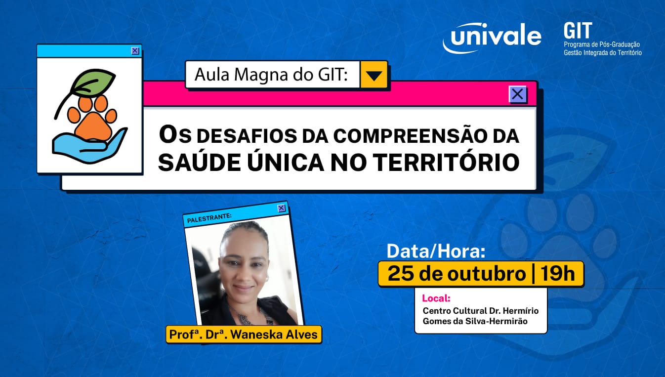 GOVERNADOR VALADARES – Explorando diversos aspectos da temática “Saúde Única” — conceito nascido nos Estados Unidos como“One Health” — a Aula Magna do Mestrado em Gestão Integrada do Território (GIT) da UNIVALE aconteceu na noite dessa quarta-feira (25), às 19h, no Centro Cultural Hermírio Gomes da Silva.