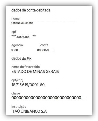 • Antes de efetuar o pagamento via Pix, conferir os dados dos “Favorecidos”, que devem ser: ESTADO DE MINAS GERAIS, documento 18.715.615/0001-60, instituição ITAU UNIBANCO S.A. Confira o exemplo abaixo: