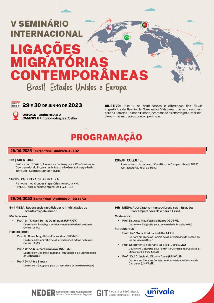 Na sexta-feira serão realizadas duas mesas redondas. A primeira, às 9h, traz o tema “Repensando mobilidades e imobilidades de brasileiros pelo mundo”, e a segunda, às 14h, discutirá “Abordagens interseccionais nas migrações contemporâneas do e para o Brasil”. Os debates serão feitos por professores de instituições como Univale, Igot/UL, UFJF-GV, PUC-MG, Ufes e Cefet-MG, e em pauta estarão temas como transformações nos territórios para onde os brasileiros vão, condições dos movimentos migratórios e deportações.