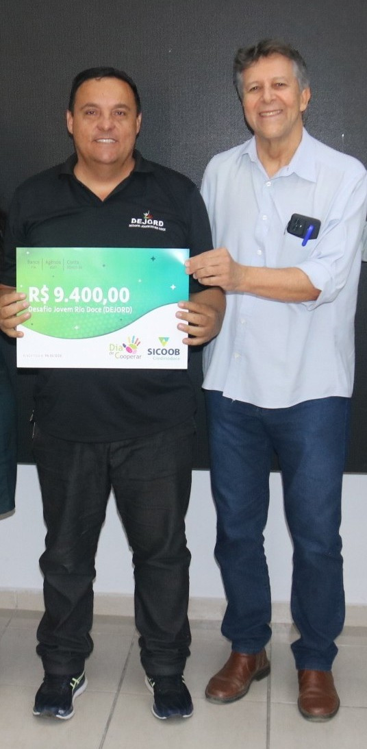 “Em nome do Dejord eu quero agradecer ao Sicoob pela doação. O Dejord também teve a oportunidade de ver centenas de assistidos formando também suas famílias, sendo transformados, com a participação de pessoas e empresas iguais ao Sicoob, que reconhece o alcance social da entidade e contribui para a existência desse trabalho” – Marco Henrique, Desafio Jovem Rio Doce (Dejord).