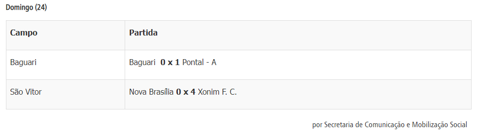 O Campeonato Distrital é uma iniciativa da Secretaria de Cultura, Esporte, Lazer e Turismo (SMCELT). A próxima rodada será no próximo domingo, 1º de outubro.