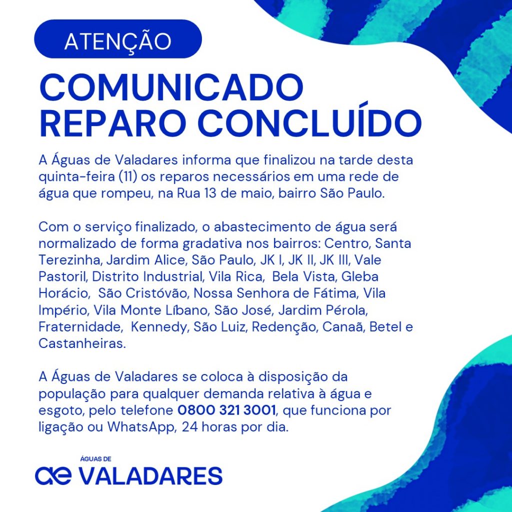 GOVERNADOR VALADARES – A empresa Águas de Valadares, ou Aegea, informou que o reparo em uma adutora rompida na rua 13 de Maio, no bairro São Paulo, foi finalizado na tarde desta quinta-feira (11). A rede de água foi danificada durante a manhã e causou a paralisação no abastecimento em 25 bairros da cidade.