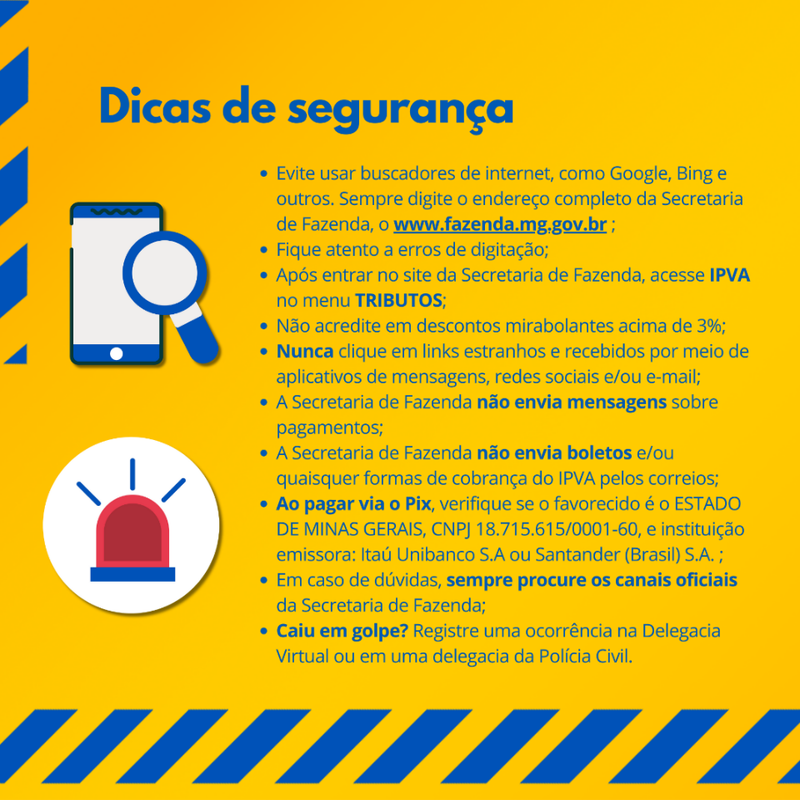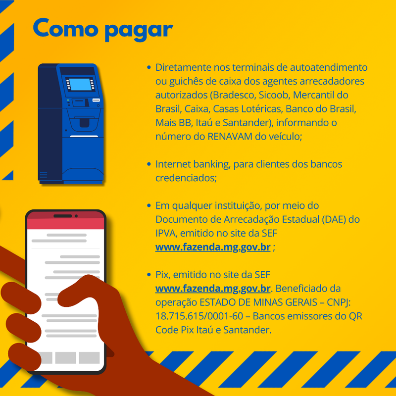 Para realizar o pagamento, basta acessar o site da Secretaria de Fazenda (www.fazenda.mg.gov.br), selecionar a área do IPVA e digitar o número do Renavam do veículo. O sistema permite gerar a guia de arrecadação ou o código Pix.