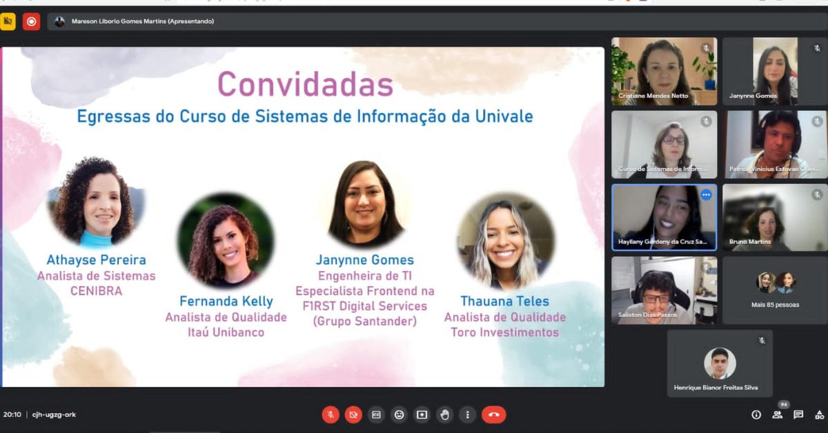 GOVERNADOR VALADARES – O curso de Sistemas de Informação da UNIVALE promoveu uma roda de conversa na terça-feira (7), com o tema “Mulheres na Tecnologia: Experiências, desafios e oportunidades”, em que quatro egressas compartilharam sobre suas histórias no mercado de trabalho, em uma carreira que ainda é predominantemente masculina. O debate sobre a inclusão de mulheres em profissões ligadas à tecnologia foi realizado em uma plataforma virtual, com a participação de um grupo de estudantes do último período do curso.