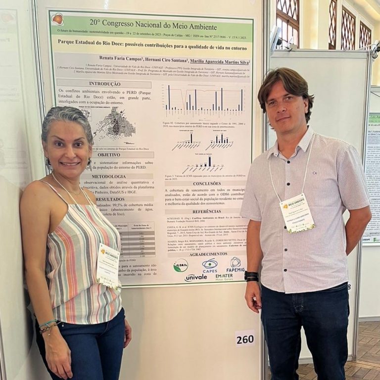 GOVERNADOR VALADARES – Com o objetivo de estimular discussões envolvendo a temática “O futuro da humanidade: sustentabilidade em questão”, o 20º Congresso Nacional de Meio Ambiente de Poços de Caldas foi realizado nos dias 19, 20, 21 e 22 de setembro e contou com a participação de professores e discentes do Mestrado em Gestão Integrada do Território (GIT) da UNIVALE e de diversos outros cursos da instituição. Os grandes destaques da edição foram os trabalhos científicos realizados por pesquisadores de todo o Brasil. E a comunidade acadêmica da UNIVALE pôde contribuir com 19 publicações, agregando alcance e visibilidade para as suas produções.