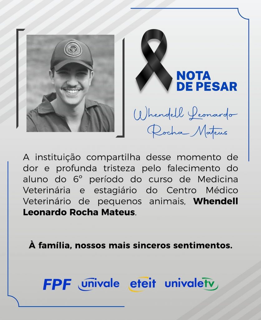 Whendell Leonardo era aluno do 6º período do curso de Medicina Veterinária da Univale e atuava como estagiário no Centro Médico Veterinário de Pequenos Animais da instituição. A Univale emitiu uma nota de pesar lamentando profundamente a perda do estudante e expressando solidariedade à família.