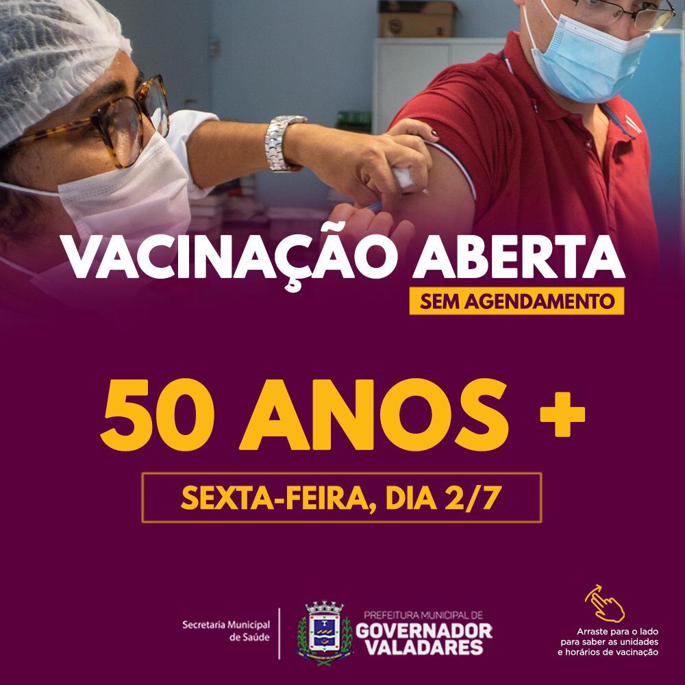 A Secretaria Municipal de Saúde (SMS) divulgou o cronograma de vacinação contra a covid-19 para esta sexta-feira (2) em Governador Valadares. Dessa vez, fazem parte do público-alvo pessoas com 50 anos ou mais, sem comorbidades. De acordo com a SMS, é necessário levar documento de identificação com foto, cartão do SUS e cartão de vacina (se tiver).
