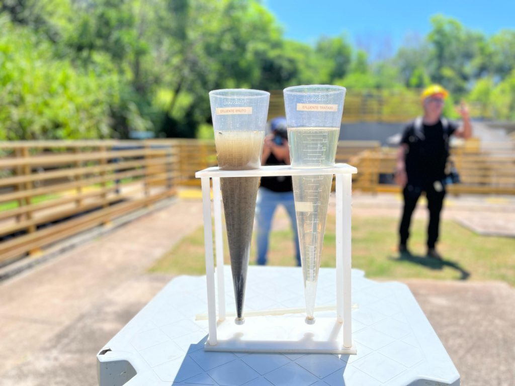 Do lado esquerdo esgoto bruto e do lado direito água após o processo de tratamento – FOTO: Igor França/ DRD